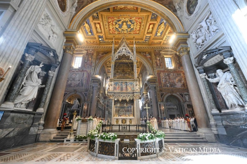 أخيرًا، أودّ أن أُشير إلى بُعدٍ أساسيّ في رسالة الكاتدرائيّة: الليتورجيّا. فهي “القمّة التي يرتقي إليها عمل الكنيسة […] والمنبع الذي تنبع منه كلّ قوّتها” (المجمع الفاتيكانيّ الثّاني، دستور في الليتورجيا المقدّسة، المجمع المقدّس، 10). وفيها نجد جميع الموضوعات التي أشرنا إليها: نحن بُنِينَا هيكلًا لله، ومَسكِنًا له في الرّوح، ونتلقّى قوّة لنبشّر بالمسيح في العالم (راجع المرجع نفسه، 2). لذلك، يجب الاعتناء بها، في مكان كرسي بطرس، بحيث يمكن أن نقدّمها مثالًا يُحتذى به لشعب الله كلّه، مع احترام القوانين، والانتباه إلى الحساسيّات المختلفة للذين يُشاركون، بحسب مبدأ التّثاقُف الحكيم (راجع المرجع نفسه، 37-38)، وفي الوقت نفسه الأمانة لأسلوب الرّصانة المَهيب الذي يُميّز التّقليد الرّومانيّ، والذي يمكن أن يُفيد كثيرًا نفوسَ المشاركين بشكلٍ فعّال فيها (راجع المرجع نفسه، 14). لنُولِ اهتمامًا خاصًّا حتّى تعبّر بساطة الطّقوس هنا عن قيمة العبادة من أجل نموّ جسد الرّبّ كلّه نموًّا متناغمًا. قال القدّيس أغسطينس إنّ “الجمال ليس إلَّا المحبّة، والمحبّة هي الحياة” (عظة 365، 1). الليتورجيّا هي المجال الذي فيه تتحقّق هذه الحقيقة بأسمى أشكالها، وأتمنّى أنّ كلّ من يقترب من مذبح كاتدرائيّة روما يمكنه أن يغادر بعد ذلك وهو ممتلئ بهذه النّعمة التي يريد الرّبّ يسوع أن يفيضها على العالم (راجع حزقيال 47، 1-2. 8-9. 12).